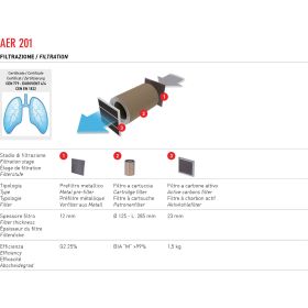 Il depuratore portatile AER 201 permette di filtrare i fumi di saldatura in ambienti chiusi o difficili da raggiungere con i normali sistemi di abbattimento dei fumi, ed è ideale per concentrazioni medio-basse di inquinanti e per un uso intermittente. Efficienza di filtrazione: M >99%. AER 201 viene fornito con un tubo flessibile e una bocchetta di aspirazione in plastica, mentre un magnete assicura il fissaggio sicuro in qualsiasi posizione. È possibile aggiungere un secondo tubo flessibile in uscita con diametro 50 mm e lunghezza 2 m. NON adatto all’uso in ambienti potenzialmente esplosivi.