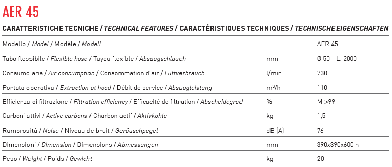 AER 45 viene fornito con un tubo flessibile e una bocchetta di aspirazione in plastica, mentre un magnete assicura il fissaggio sicuro in qualsiasi posizione.