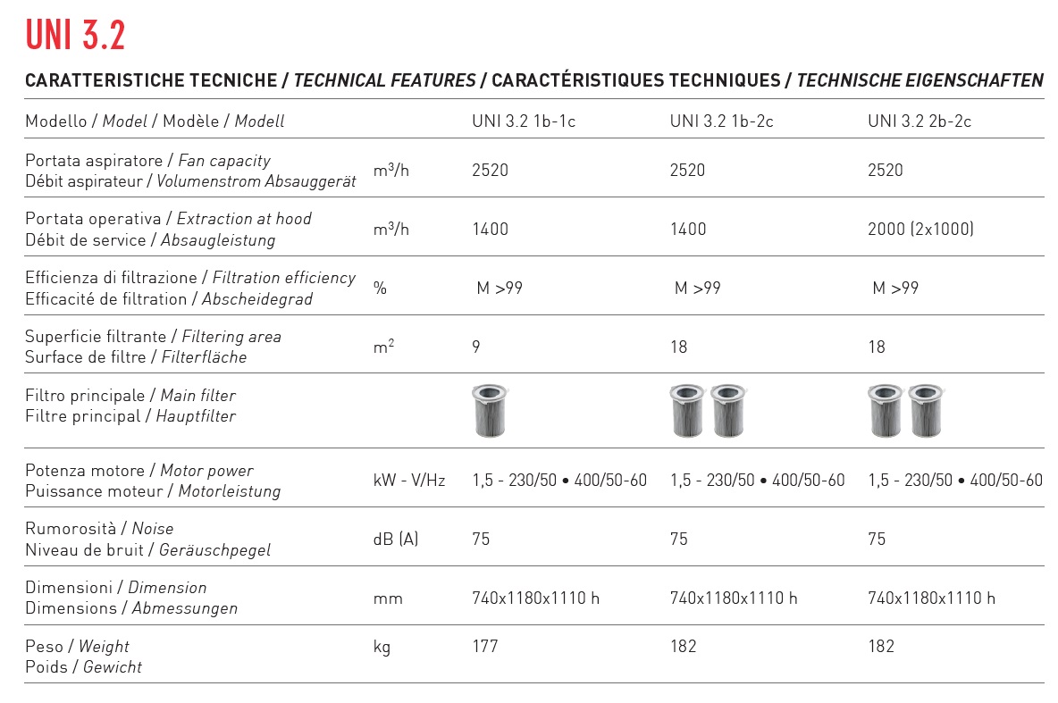 - UNI 3.2 per 1 braccio aspirante con 2 cartucce - efficienza di filtrazione BIA "M" >99%