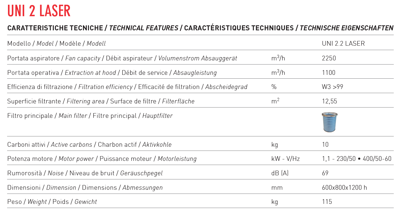 La sezione filtrante è costituita da una serie di filtri speciali per un'efficienza finale di filtrazione BIA "M" >99%. Doppio stadio di filtrazione a carboni attivi per catturare fumi caidi, fumi basici e SOV. Un filtro anti-scintille è incluso nella dotazione standard dell'UNI 2.2 C W3 Laser .